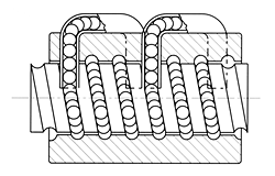 此種型式是兼具外循環滾珠絲桿及內循環滾珠絲桿特點,在鋼珠滾動于螺桿與螺帽之間的溝槽而前進,在螺帽的尾端田端蓋循環器導引至螺帽本體的迴流孔中,一般與外循環相同為多倦鋼珠一次循環,只是少了外循環管。