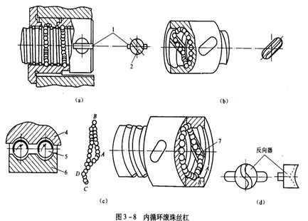 如圖3-8所示為內循環滾珠絲杠。內循環均采用反向器實現滾珠循環,反向器有兩種類型。
