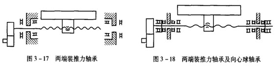 ? 如圖3—17所示,把推力軸承裝在滾珠絲杠的兩端,并施加預(yù)緊拉力,這樣有助于提高剛度,但這種安裝方式對絲杠的熱變形較為敏感,軸承的壽命較兩端裝推力軸承及向心球軸承方式低。