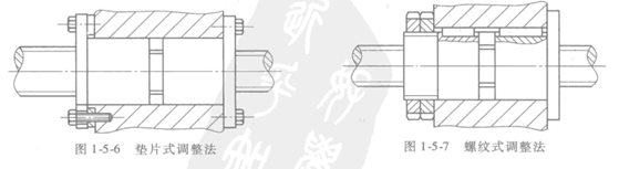 (1)墊片調整法墊片調整法如圖1.5.6所示。一般用螺釘把兩個帶凸緣的螺母固定在殼體的兩側,并在其中一個螺母的凸緣中間加墊片,調整墊片的厚度使螺母產生軸向位移,以消除間隙和產生預緊力。